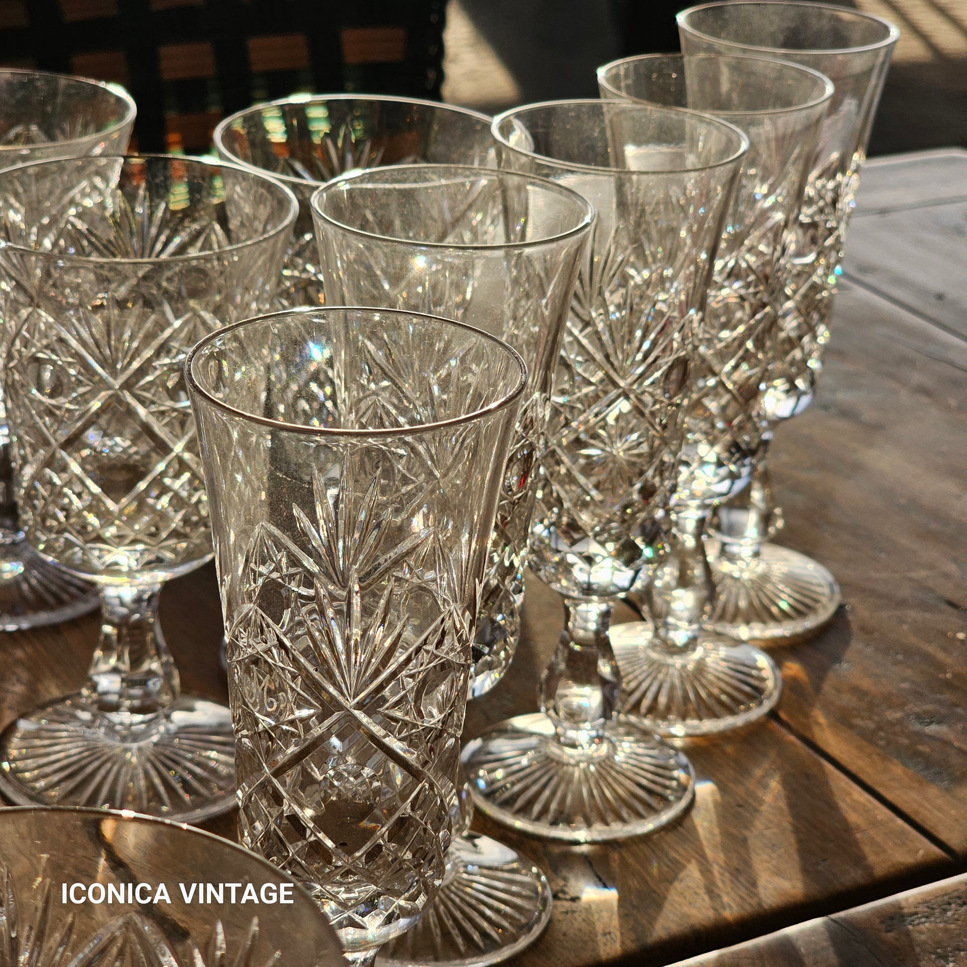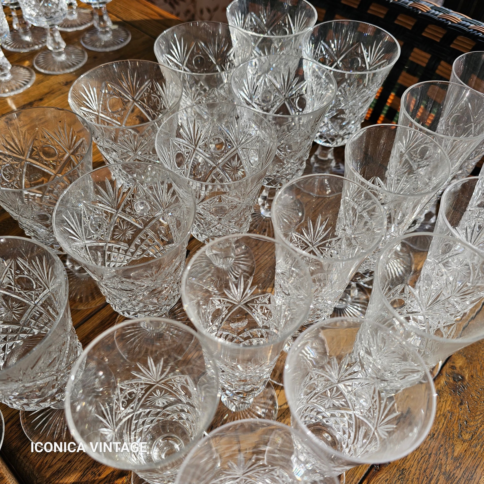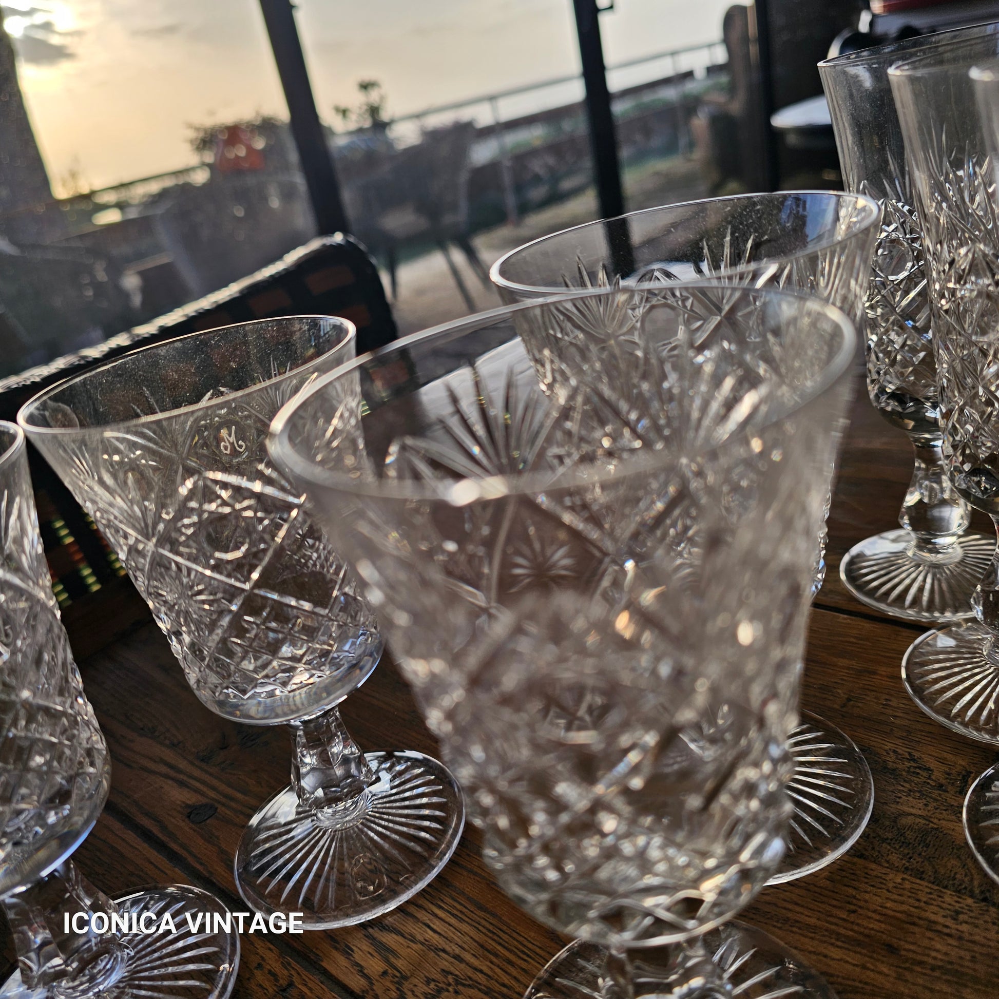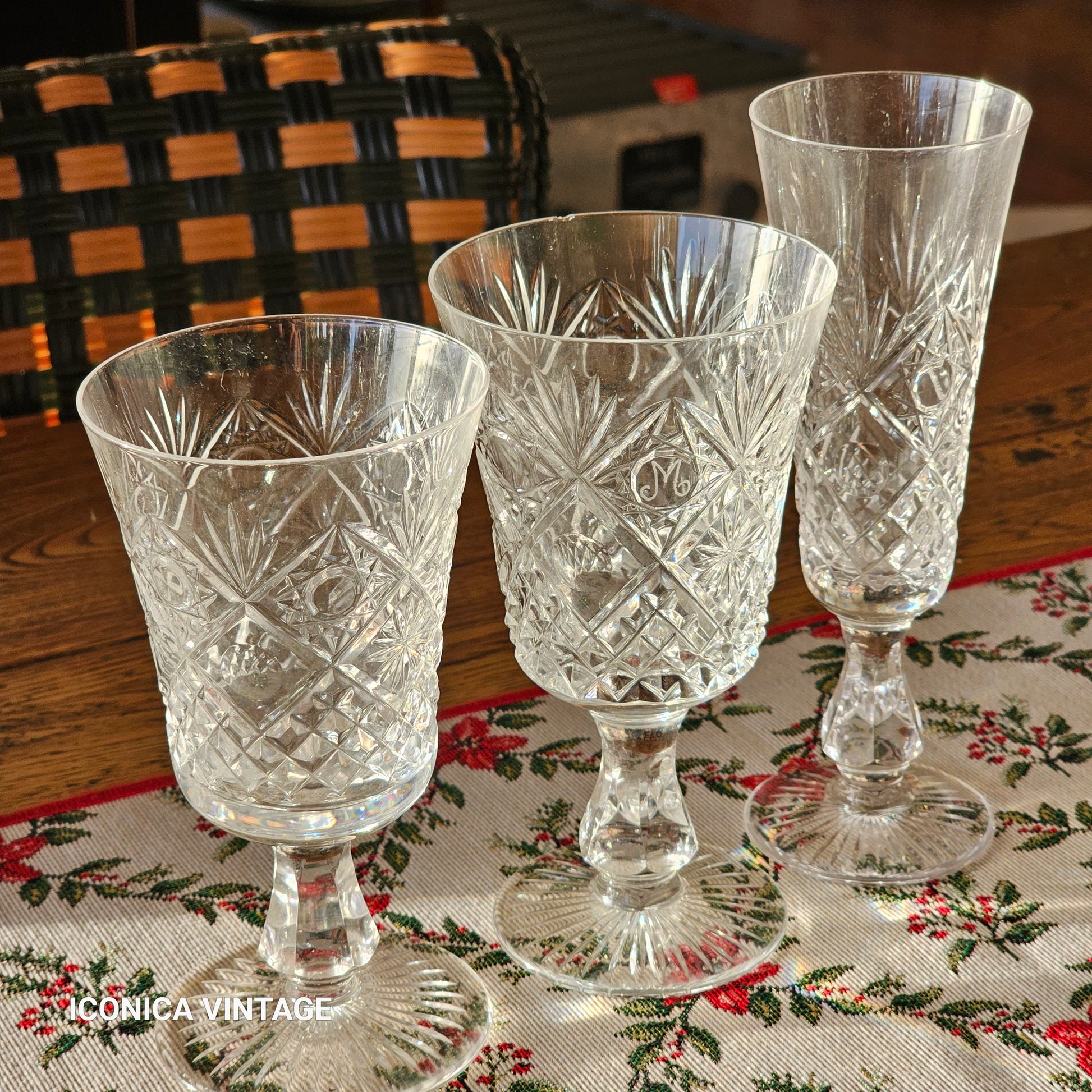 Juego de cristalería Dijon de 30 piezas, cada una finamente tallada con motivos geométricos superpuestos que capturan la luz con elegancia. Grabado al ácido con una discreta inicial M, este conjunto refleja la artesanía francesa de mediados del siglo XX. Cristal de Lorraine. Ideal para comidas formales y colecciones de cristal de época. Perfecto para quien aprecia el diseño vintage de calidad y la funcionalidad refinada. Contiene