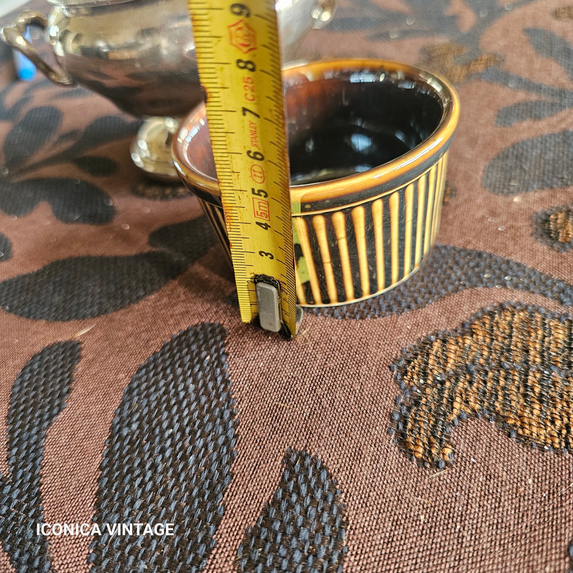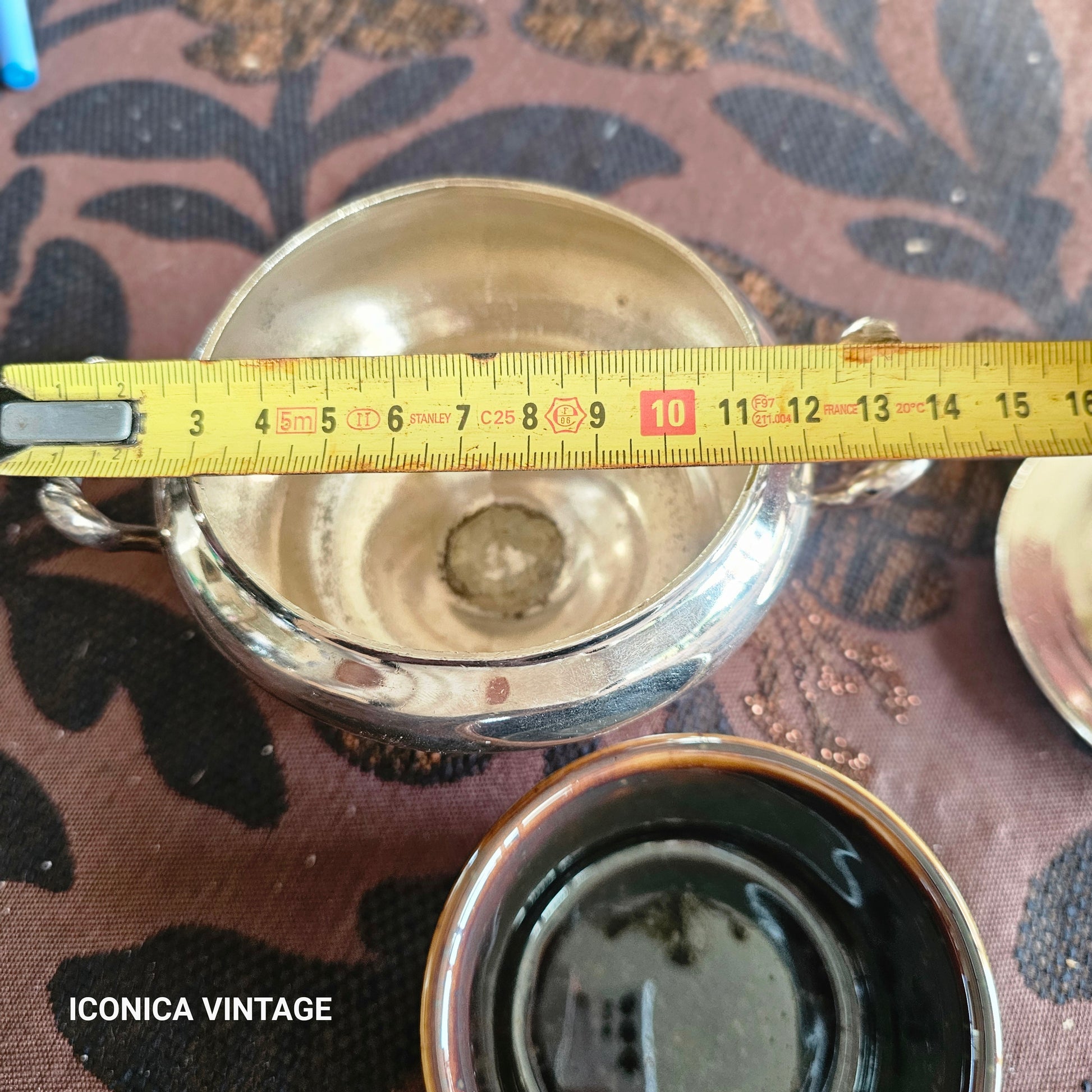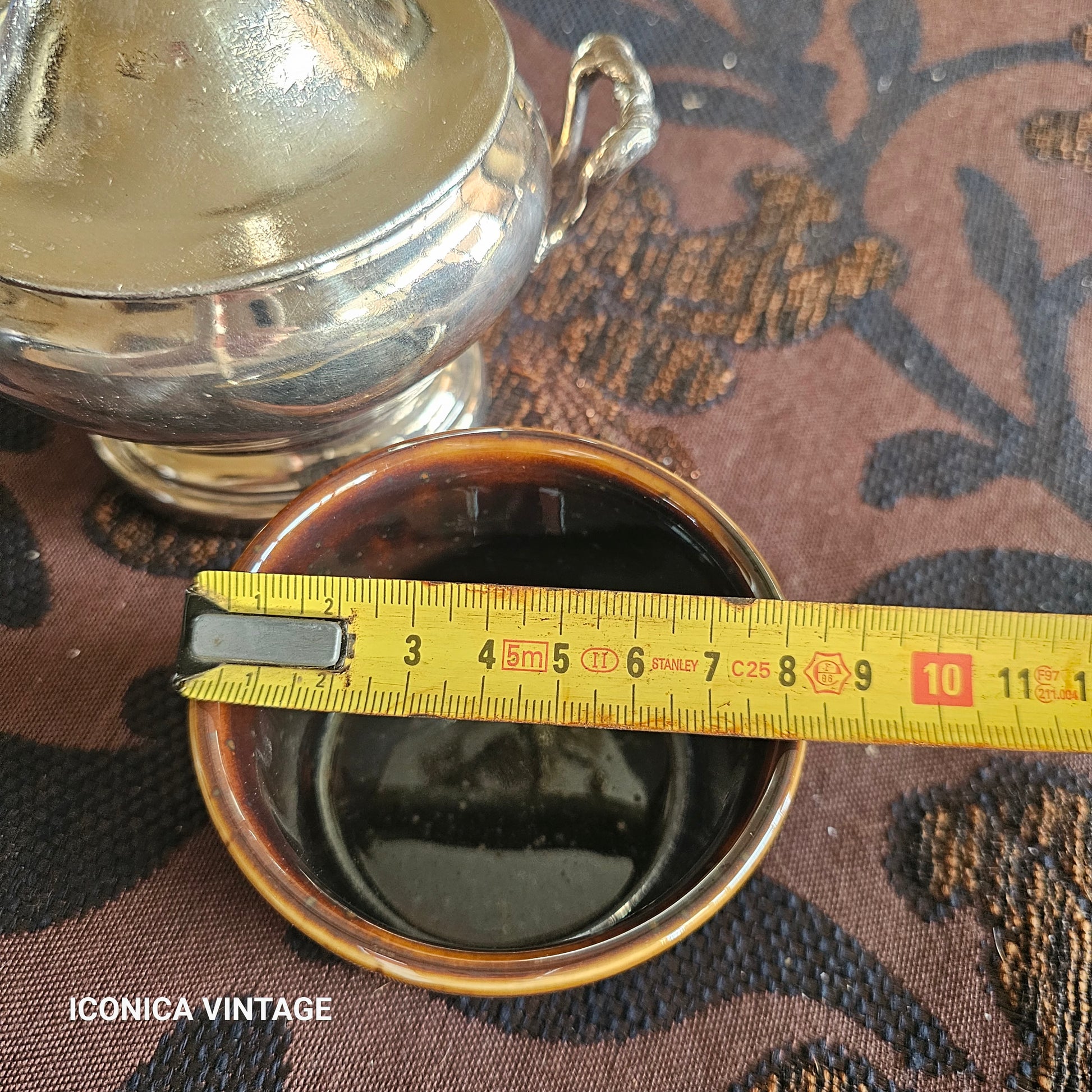 Las medidas son : Moldes de 8 cm de diámetro y 5 cm de altura, que encajan con el interior de la mini sopera, que mide, de ancho, contando con las asas, 15 cm de longitud. De diámetro interior, 7 cm. Altura total, 10 cm. Altura del recipiente, 8 cm. Observe las fotografías, forman parte de la descripción. Alemania, mediados del siglo XX. Se trata de objetos con uso anterior y, por tanto, pueden presentar algún signo coherente con un buen uso de los mismos en el pasado.