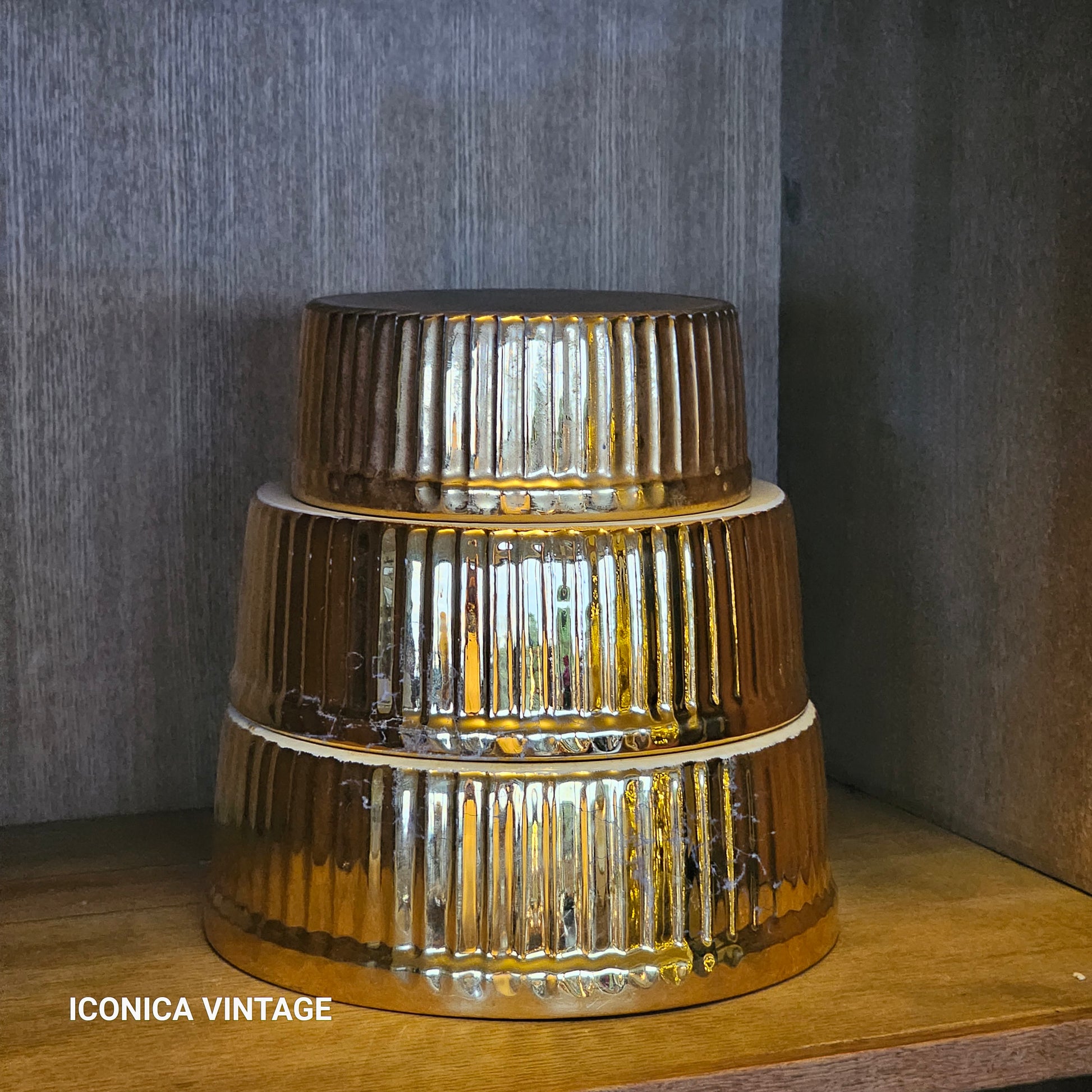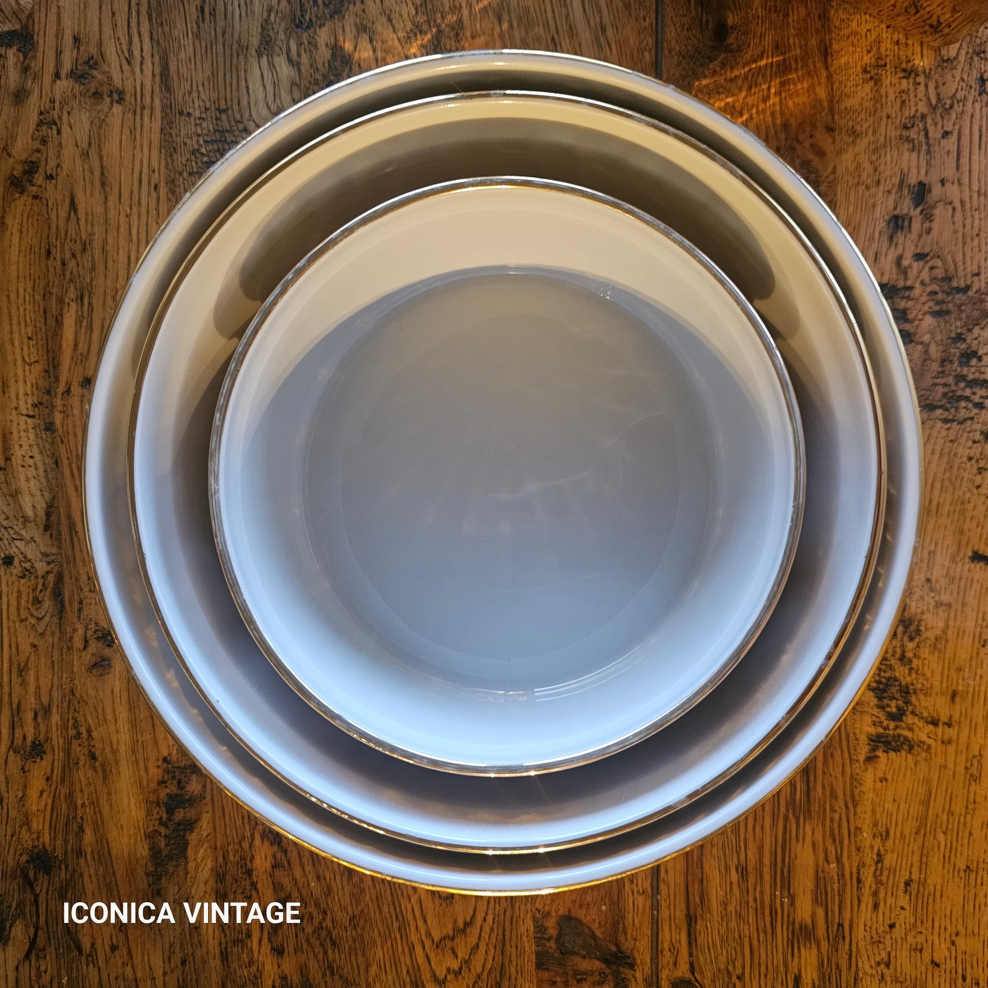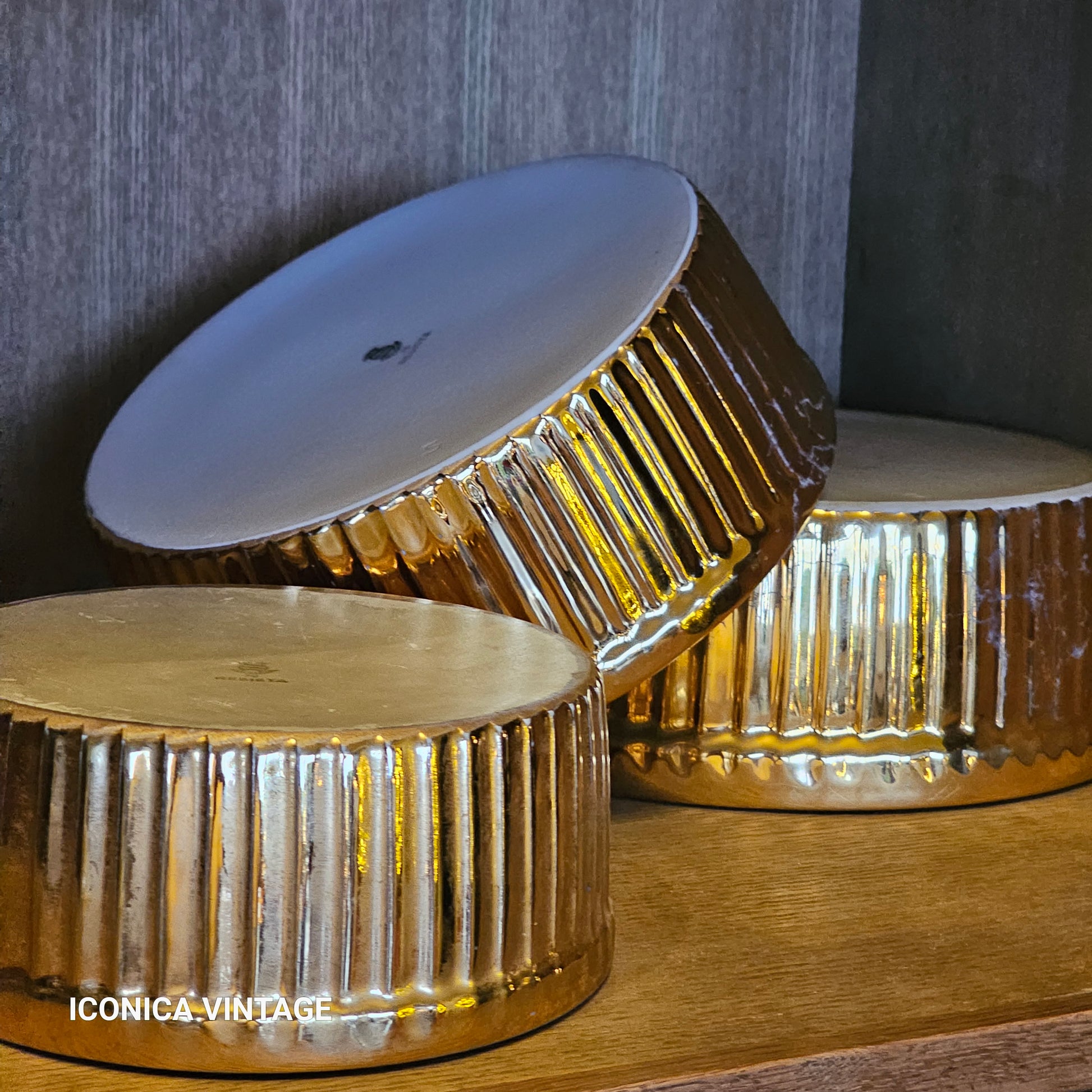 Moldes de porcelana de gran calidad, esmaltados en oro, diseñados para uso en horno. Refractarios versátiles que combinan funcionalidad y elegancia, transformando tus preparaciones culinarias en presentaciones de lujo. Su acabado dorado les confiere un carácter decorativo que enaltece cualquier mesa, aportando un toque festivo y sofisticado. Ideales para recetas exclusivas y presentaciones que demandan excelencia. Fabricación de tradición. Buen estado vintage. Pueden presentar ligeros signos de un uso anterior, sin accidentes ni golpes. Observe las fotografías, forman parte de la descripción. Inglaterra, siglo XX. Los tres tienen diferentes medidas, pudiendo guardarse unos dentro de otro, ocupando poco espacio: