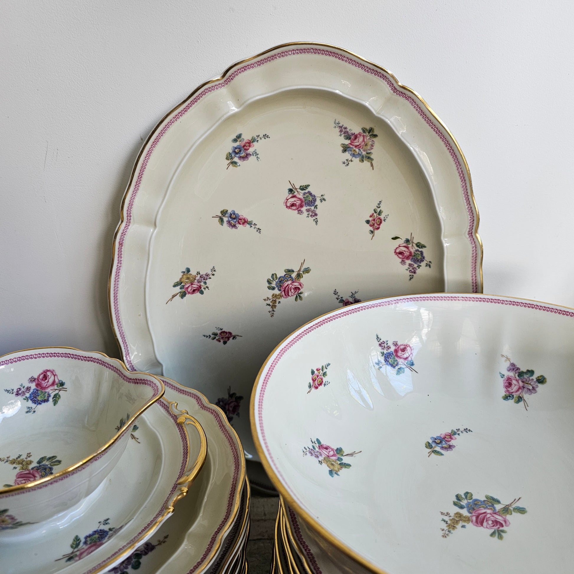 El romanticismo en la mesa Vajilla de porcelana de la prestigiosa manufactura francesa Bernardaud, datada en mediados del siglo XX. Servicio completo para 12 comensales que combina elegancia clásica con delicadeza floral. Fondo de color lino que proporciona calidez y sofisticación, decorado con bouquets de flores multicolores. Detalle distintivo: filo tipo cenefa rosa en el borde del ala del plato, que añade un toque de refinamiento. En muy buen estado de conservación, esta vajilla es un testimonio de la artesanía francesa de calidad. Ideal para coleccionistas de porcelana vintage o para quien desee traer la elegancia de mediados de siglo a su mesa.