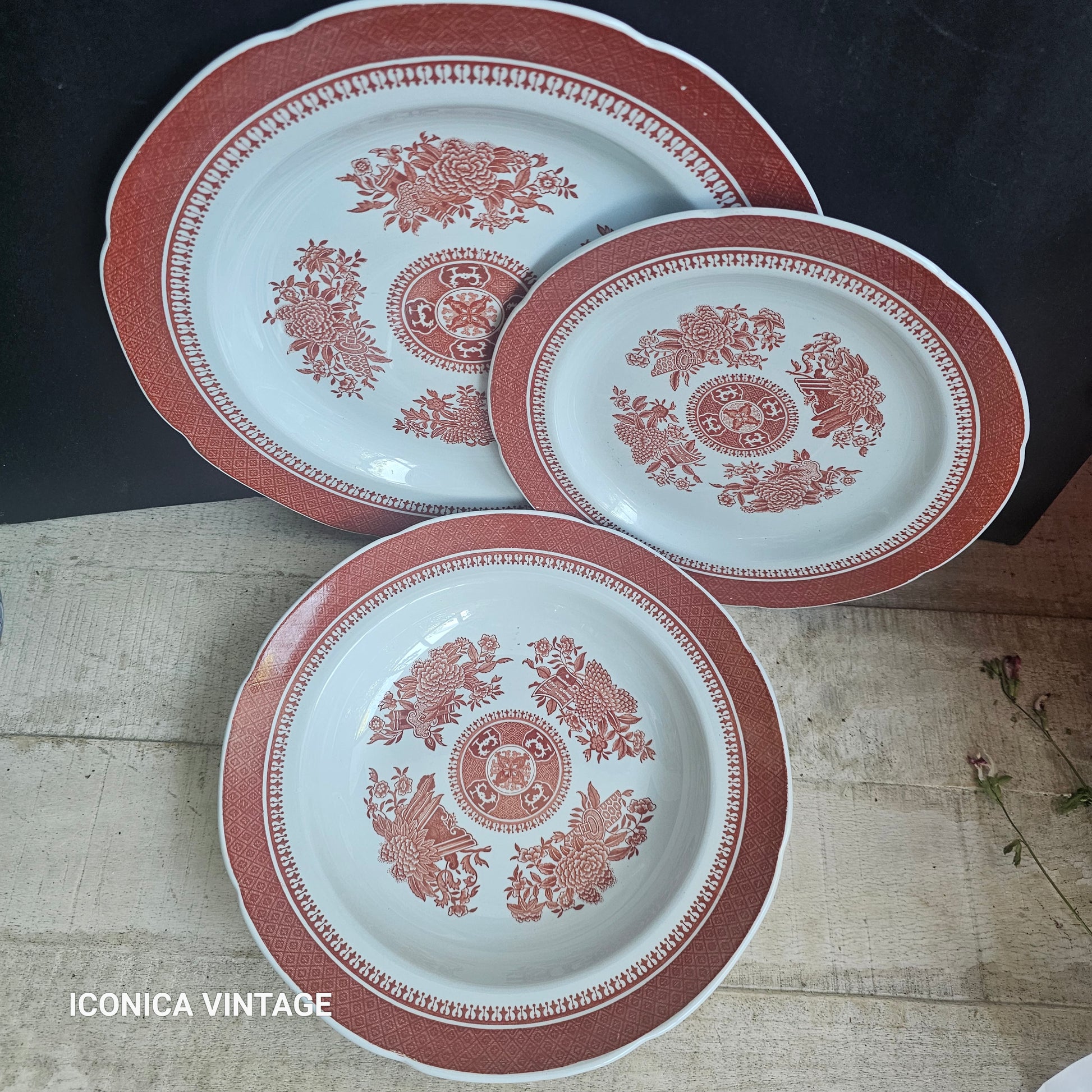Excepcional juego de 13 piezas para 4 únicos comensales, realizada por Spode (Inglaterra), recreando un icónico diseño oriental que se empleaba en la porcelana de exportación a finales del siglo XVIII, principios del siglo XIX. Es entonces, coincidiendo con los generales de la familia Fitzhugh, que incluso dirigieron la Compañía Británica de las Indias Orientales, se exportaba este tipo de patrón. A ellos se les permitía ejercer el comercio privado y, por ello, esta vajilla lleva su nombre, Fitzhugh. El diseño se caracteriza por un medallón central que se rodea de cuatro agrupaciones de flores de las cuatro estaciones -para la primavera, peonia, para el verano, loto, para el otoño, crisantemo y para el invierno, prunus. Muy buen estado vintage.